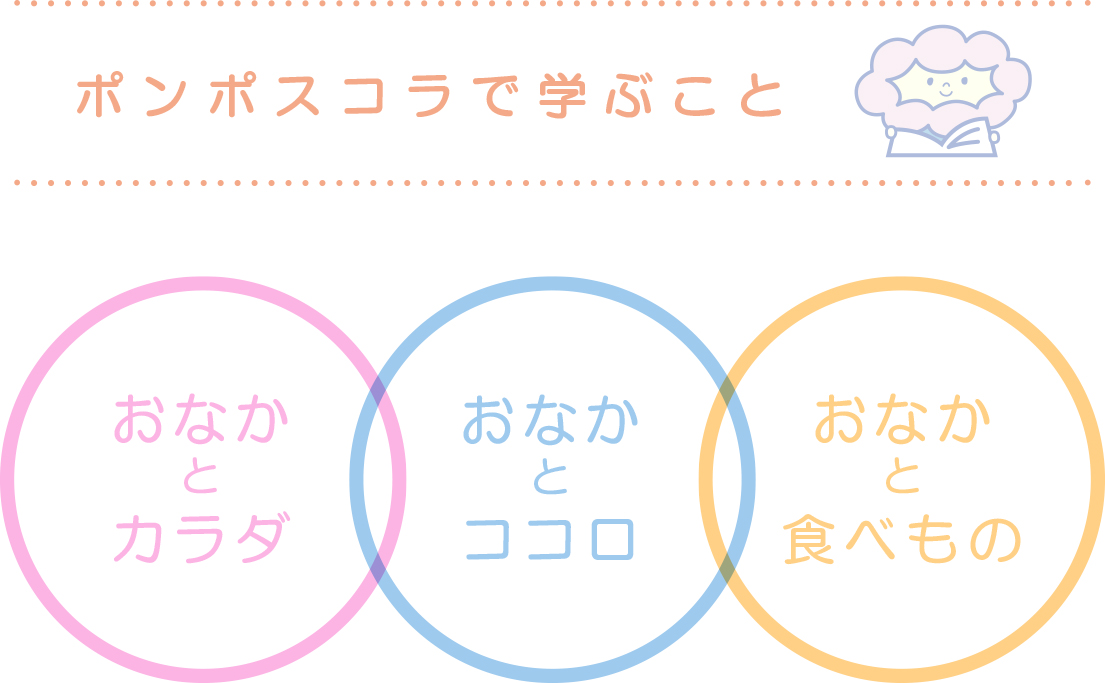 ポンポスコラの授業は全部で6コマ(6ページ)を予定しています。1〜2コマずつ、少しずつゆっくり月次更新していく予定です。「おなかのがっこう」ですから途中に給食やお楽しみコーナーも予定しています。どうぞ楽しみながら腸活のおべんきょうにお付きあいくださいませ。
