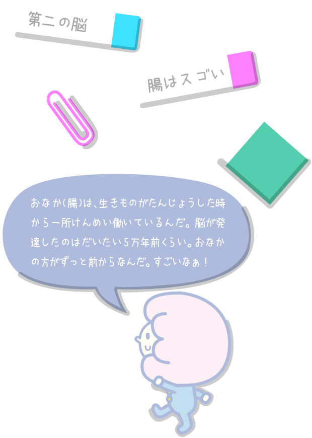 「心の元気のもと」になる神経伝達物質の一つセロトニンは、別名「幸せホルモン」といわれていて、幸福感や安心感につながっているんだ。だから、腸内フローラをキレイにすればハッピーな気持ちになるってこと!他にも腸はドーパミンっていう「集中力」や「学習意欲」につながる神経伝達物質も合成しているよ。それに腸管免疫(全身の免疫の60%)も腸内で合成されているんだって。おなかはとってもすごい働きをしているんだね!