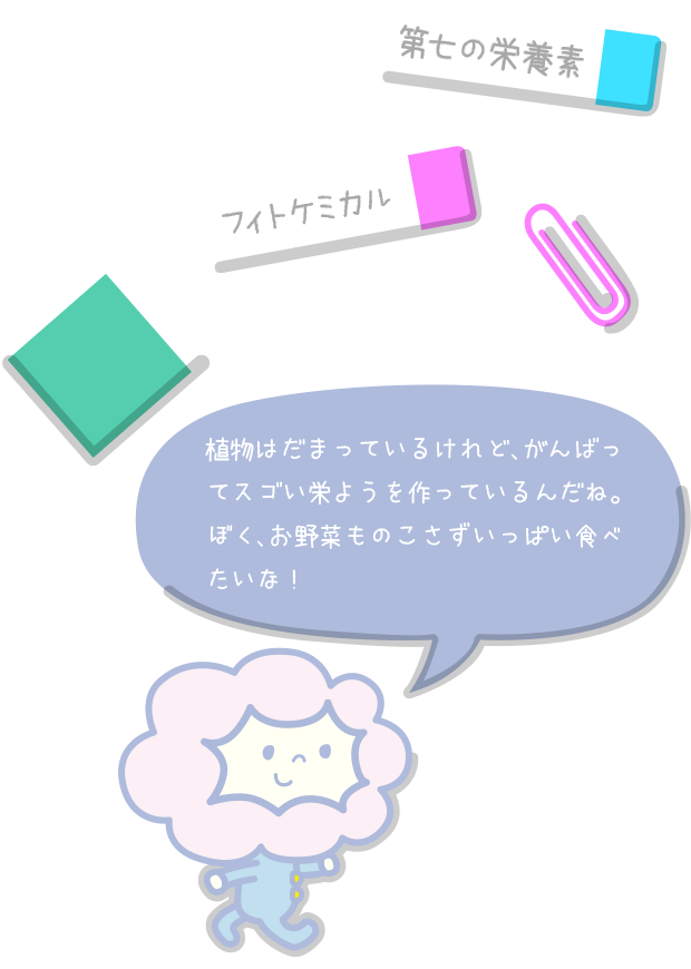野菜や果物をはじめとする植物は、置かれた環境を自ら変えることができません。そこで植物は紫外線や外敵から身を守るために「フィトケミカル」と呼ばれる化学物質を合成します。この物質は「第七の栄養素」と呼ばれていて、フィトケミカルの持つ抗酸化力が、私たちの健康維持・改善に役立つと考えられて研究されています。