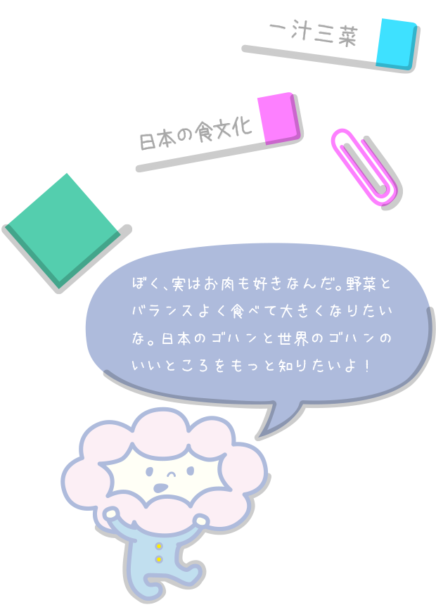 短いあいだにゴハンはすごく変わったけど、ヒトのカラダはすぐには変わらないから、食べもののバランスがとっても大事なんだ。和食のいいところを取り入れて栄養バランスを考えることが、ぼくたちの時代の調和食になるんだ。